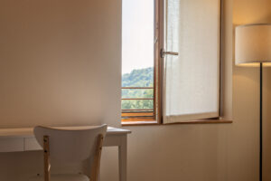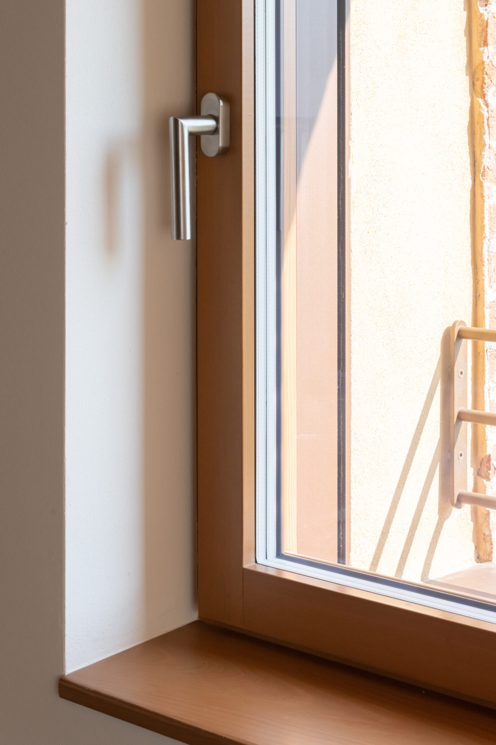 Da una parte le linee morbide e il «montantino riportato» nell’esecuzione a due ante richiamano eleganza e stile classico. Dall’altra la precisione dei profili esterni in alluminio che rivestono anta e telaio conferiscono più struttura a questo serramento.