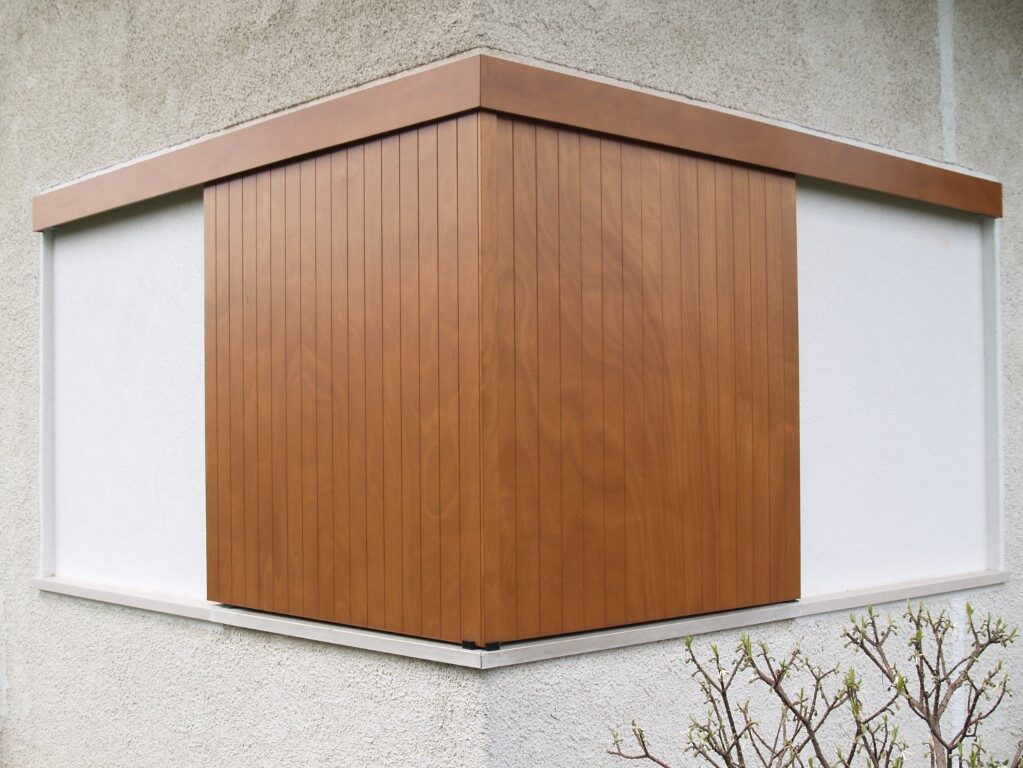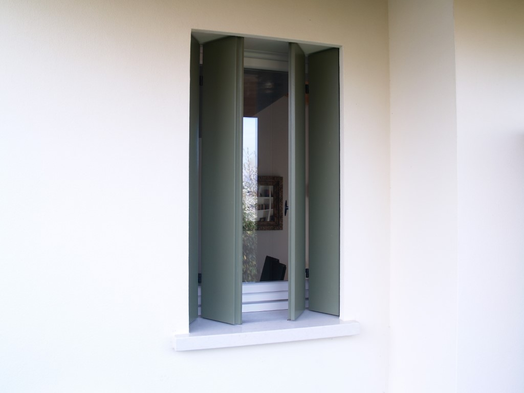 Gli scuri in alluminio hanno una struttura coibentata a sandwich ed impiegano lamiere piegate e sagomate di alluminio dello spessore variabile tra i 15 ed i 20/10.