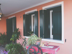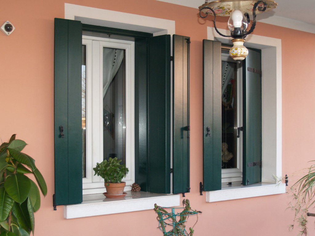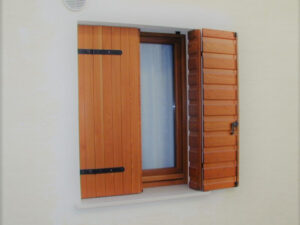 Gli scuri in legno possono essere realizzati a tavola doppia incrociata, a doghe verticali o con pannelli di multistrato di okumè per esterni.